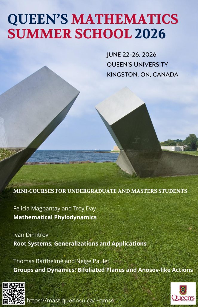 Le cours d’été en mathématiques à Queen’s est ouverte aux étudiants de premier cycle et de maîtrise qui souhaitent passer une semaine à apprendre des mathématiques passionnantes et de pointe sur le magnifique campus de l’Université Queen’s, au bord du lac Ontario. Il y aura trois cours, chacun avec 9 heures de cours magistraux durant la semaine. Un financement limité est disponible pour les frais de déplacement et/ou l’hébergement sur le campus. Pour plus de détails, visitez leur site web.